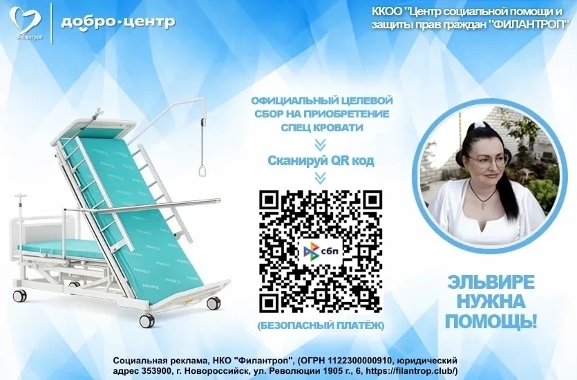 Благотворительный клуб "Филантроп" объявляет о начале целевого сбора средств для лежачей больной Эльвиры на специализированную кровать. Легко, безопасно и быстро помочь Эльвире ( qr.nspk.ru/BS1A001JQP... )Такая кровать крайне необходима для её повседневной жизни. Она создаёт больше возможностей, облегчая уход и улучшая качество жизни.Эта уникальная кровать играет важнейшую роль в процессе реабилитации самых тяжелых пациентов и открывает дополнительные возможности для улучшения качества жизни. Кровать-вертикализатор лифт-ап — это современное устройство, оснащенное электроприводом и рядом инновационных функций.Вертикализатор помогает пациентам с тяжёлыми заболеваниями подготовиться к вертикальному положению и, как следствие, к самостоятельной ходьбе. Особенно эффективно он применяется при спинальных травмах, повреждениях головного мозга, ДЦП, мышечной дистрофии, инсульте, инфаркте и других недугах.Благодаря электрической кровати-вертикализатору можно достичь оптимальной работы внутренних органов, адаптации сердца и сосудов к физической активности, предотвращения застойных процессов и пневмонии, профилактики контрактур и нарушения функций опорно-двигательного аппарата, улучшения актов дефекации и мочеиспускания.Устройство включает также систему переворачивания, полностью автоматизированное туалетное устройство и кардио-кресло для медицинских нужд. Все это существенно облегчает уход за пациентами с максимальными функциональными ограничениями, а также снимает часть нагрузки с родственников и сиделок.Помощь в приобретении этой функциональной кровати для Эльвиры не только облегчит её жизнь, но и станет важным шагом на пути к реабилитации тяжёлого пациента.Давайте объединяться, чтобы творить добро, ведь так мир станет лучше, а кто-то обретёт счастье.Для пожертвования, пожалуйста, сканируйте QR-код на картинке или переходите по ссылке, указанной в начале.Спасибо за ваше неравнодушие!