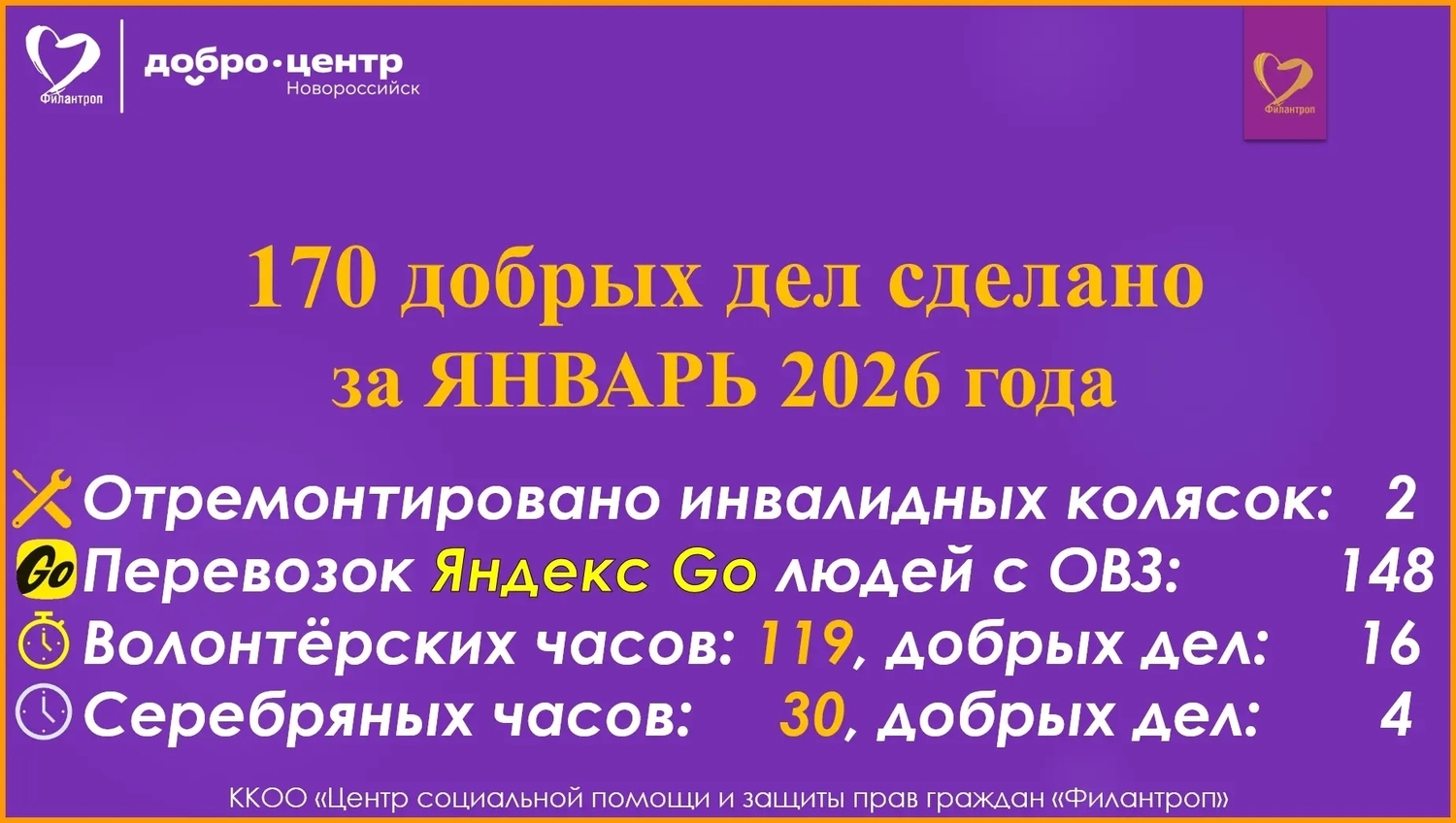 Уважаемые друзья! В наступившем году ККОО "Центр социальной помощи и защиты прав граждан "Филантроп" уже продемонстрировала впечатляющие результаты, совершив 170 добрых дел. Среди них – ремонт двух инвалидных колясок, обеспечение транспортировки 148 нуждающихся инвалидов к месту лечения и обратно, а также 149 часов волонтерской работы, приведшей к выполнению 20 дополнительных благотворительных акций. Мы призываем вас стать частью доброго движения! Вместе мы можем сделать мир добрее. Присоединяйтесь к нам!