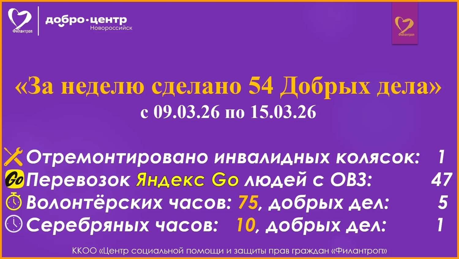 Командой Центра было осуществлено 54 добрых дела. Прошедшая неделя была весьма продуктивной: благодаря усилиям в том числе: Произведён ремонт одной инвалидной коляски, что значительно улучшило качество жизни её владельца. 47 поездок на Яндекс.Go обеспечили людям с особыми потребностями возможность свободно передвигаться по городу. 85 часов волонтёрской работы привели к реализации 6 добрых дел, поддерживающих тех, для кого это имеет первостепенное значение. Выражаем благодарность каждому, кто принимает участие в благих делах и взаимопомощи! Вместе мы создаём лучший мир.
